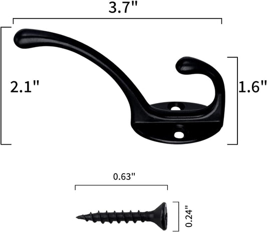 IBosins 10 Pack Heavy Duty Dual Coat Hooks Wall Mounted with 40 Screws Retro Double Hooks Utility Black No Rust Hooks for Coat, Scarf, Bag, Towel, Key, Cap, Cup, Hat (Black)