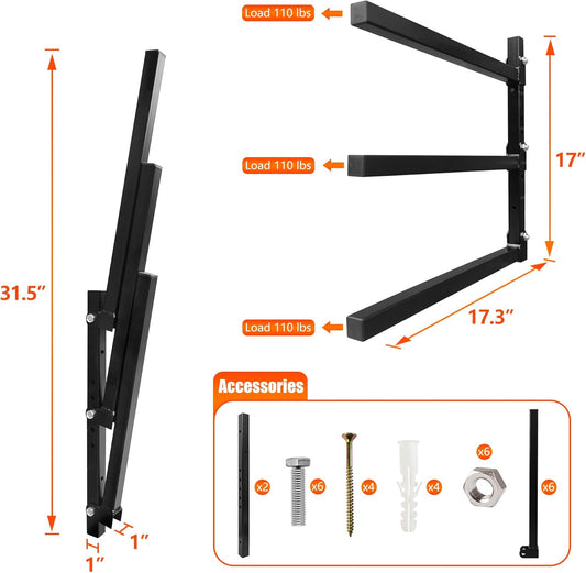 3-Tiered Collapsible Wall Mount Lumber Storage Metal Rack, 3-Level Foldable Heavy Duty Indoor Garage Wood organizer, Outdoor Adjustable Steel Multipurpose Workshop Shelf, Holds up to 330Lbs