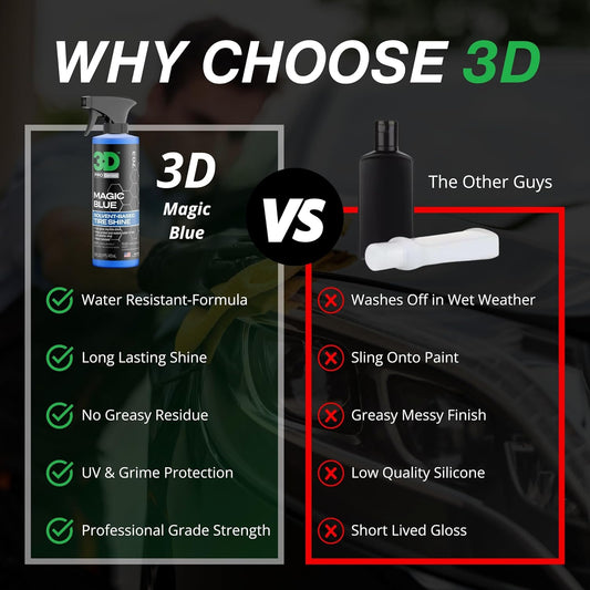 3D Magic Blue Tire Shine Spray - Water Resistant High Gloss Tire & Trim Dressing | Long Lasting Protection | No Sling, No Run Formula | Made in USA |16 oz