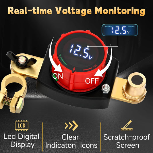 MaySpare Top Post Battery Disconnect Switch with Digital Voltage Display, DC 5-80V On Off Kill Switch, Voltmeter Power Cut Master Disconnect Isolator for Car RV Marine Boat Camper Truck Trailer