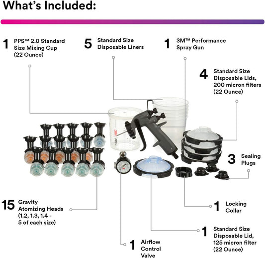 3M Performance Spray Gun Starter Kit, 26778, Includes PPS 2.0 Paint Spray Cup System, 15 Replaceable Gravity HVLP Atomizing Heads, Air Control Valve
