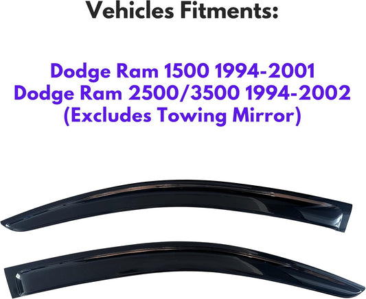 KPY Window Visor Compatible with Dodge Ram 1500 1994-2001 & Dodge Ram 2500/3500 1994-2002 (Excludes Towing Mirror), Rain Guard Side Window Vent Deflectors Tape-On Style, 1995 1996 1997 1998 1999 2000
