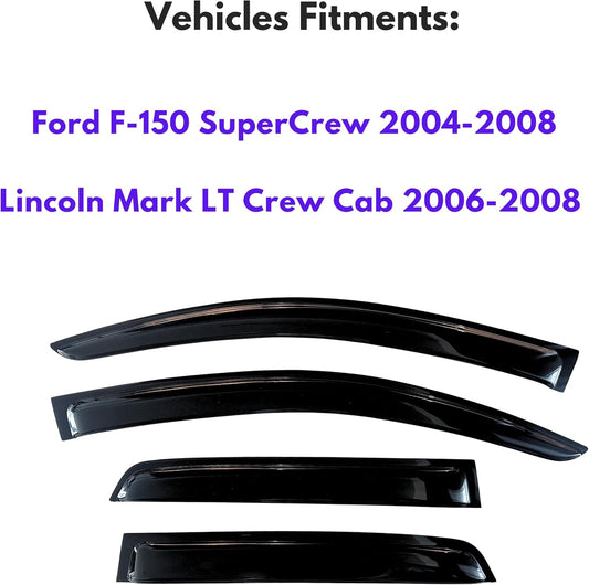 KPY Window Visor Compatible with Ford F150 SuperCrew 2004-2008 & Lincoln Mark LT Crew Cab 2006-2008, 4PC Rain Guard Side Window Vent Deflectors Tape-On Style, 2004 2005 2006 2007 2008