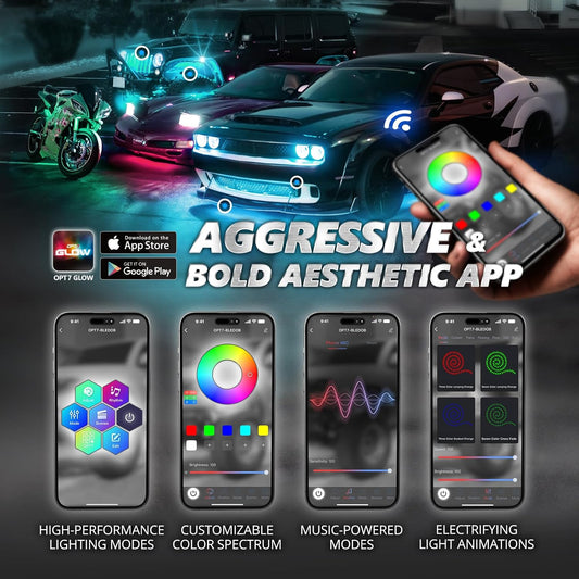 OPT7 Aura Flexible Underglow Car Lights with APP & Remote Control, Exterior Neon Accent Underbody Lighting Kit, 4 PCS RGB LED Light Strips for Cars Trucks RV, Waterproof, Multi Colors Music Mode, 12V