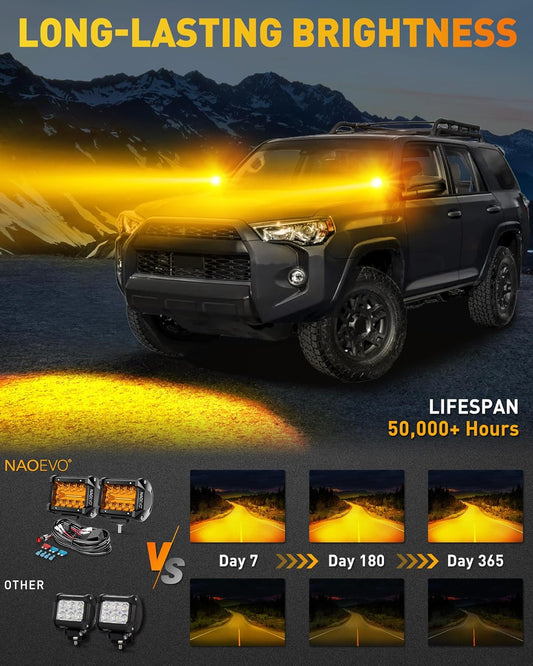 NAOEVO 4 Inch LED Pod Lights, Spot Flood Yellow LED Fog/Driving/Off Road Lights with 2 Leads Wiring Harness, Cube Pods for Truck Boat ATV UTV, 2 Pcs (Yellow)