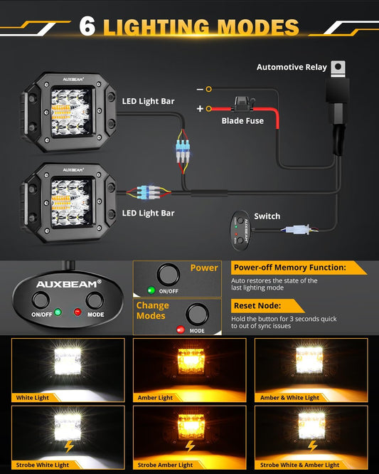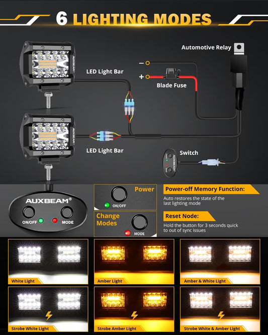 Auxbeam 4 Inch LED Pods Strobe Pod Light Bar, 120W Amber White 6 Modes Fog Light Spot Offroad Driving Lights, 12000LM Triple Row Memory Function with Wiring Harness Kit - 2 Pack
