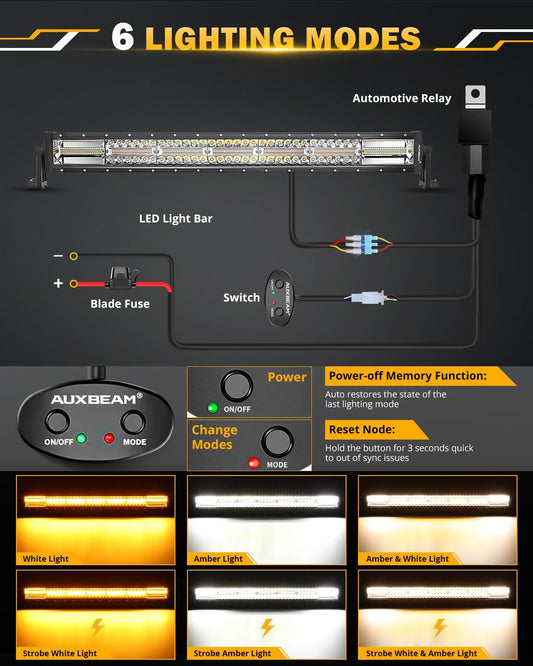 Auxbeam 30 Inch 180W LED Light Bar, 6 Modes Spot Flood Combo Offroad Lighting Amber White Strobe Fog Light, Memory Reset Function Waterproof Driving Work Light with 10FT Wiring Harness Kit