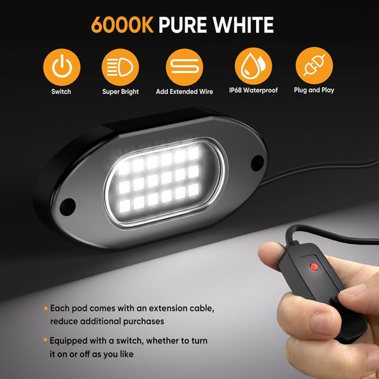 Honalia White LED Rock Lights Kits 6 Pods, 6000K Pure White Rock Lights with Switch