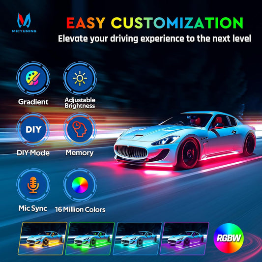 MICTUNING 8Pcs N8+ RGBW Underglow LED Lights for Cars, APP & Remote Dual Control, IP68 Waterproof Aluminum Multicolor Modes Music Soundsync Exterior Neon Accent LED Light Bar, 2 Years Warranty