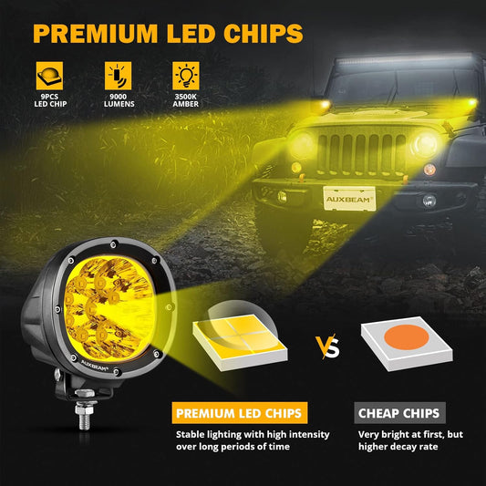 Auxbeam 4 Inch Amber Round LED Driving Light, 2PCS 90W 9000LM Yellow Fog Pods Light Bar Off-Road Flood Work Energy-Efficient Lights with DT Plug Wiring Harness Kit for Truck Jeep Pickup ATV UTV SUV