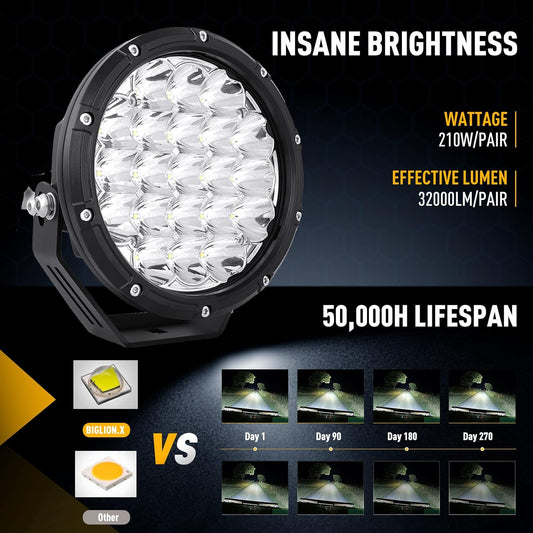 BIGLION.X 7inch Amber Round Off Road Lights Pair 210W 32000LM Super Bright Yellow LED Offroad Driving Lights Spot Lights Waterproof IP68 With EMC 12V-32V for Pickup Trucks SUV UTV