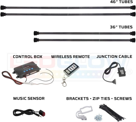 LEDGlow 4pc Million Color Multi-Color LED Underbody Underglow Accent Lighting Kit for Cars - 18 Solid Colors - 12 Unique Patterns - Music Mode - Water Resistant Tubes - Includes Control Box & Remote