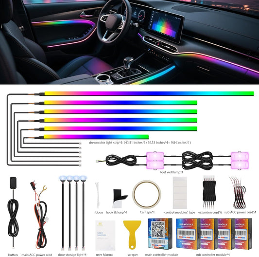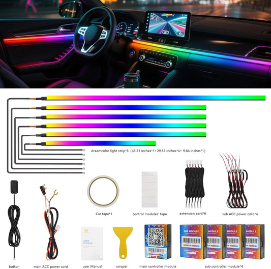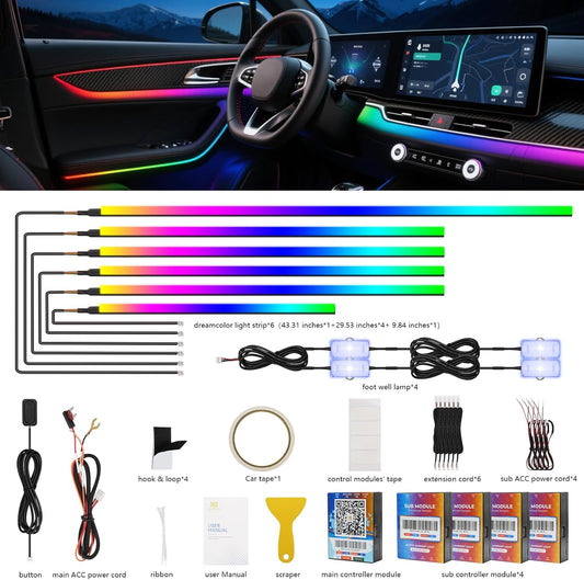 2025 Upgraded Acrylic Interior Car LED Strip Light with Self-Developed App Dreamcolor RGB 6 in 1 | Zone Control | Super Brighter LED Strips | Music Sync | 16M Colors Car Ambient Lighting