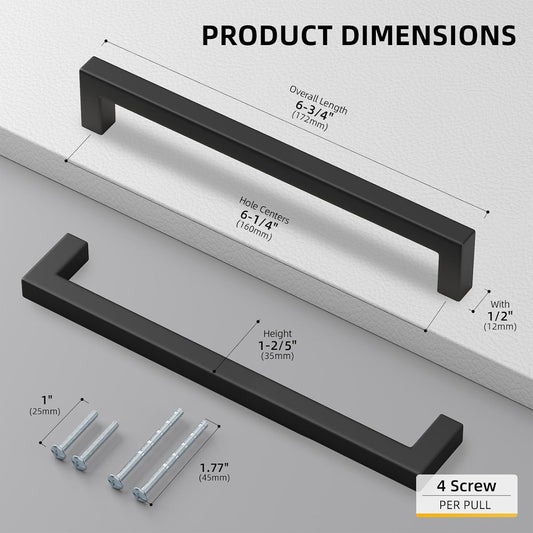 goldenwarm 150 Pack 6-1/4INCH Black Square Bar Cabinet Pull Drawer Handle Stainless Steel Modern Hardware for Kitchen and Bathroom Cabinets Cupboard,Center to Center 160mm Kitchen Cupboard Handles