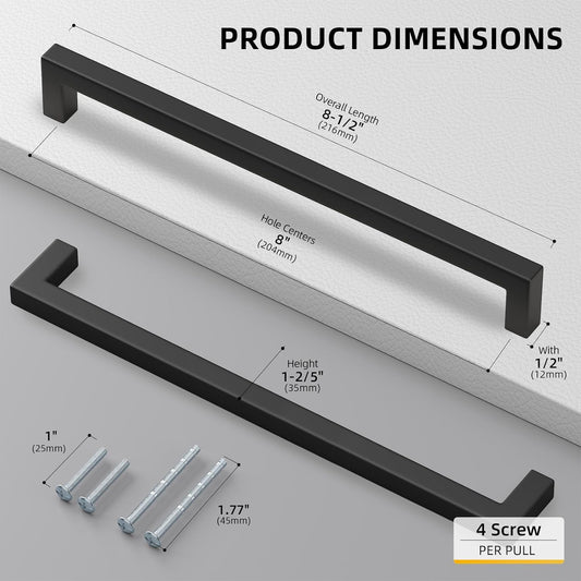 goldenwarm 10Pack 8INCH Matte Black Cabinet Pulls Kitchen Hardware, 204mm Square Bar Pulls for Cabinets Hardware, Black Drawer Pulls 8-1/2in Overall Length