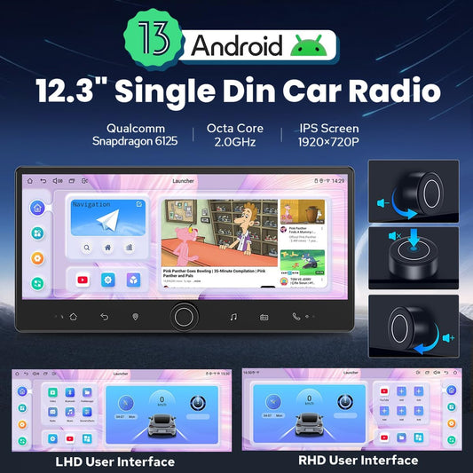 Joying 12.3" Single Din Touchscreen Radio Android 13 Head Unit with Carplay and Android Auto Detachable Car Stereo with Bluetooth, AM/FM, Subwoofer Output, GPS, Video in(JY-HTS03N8)