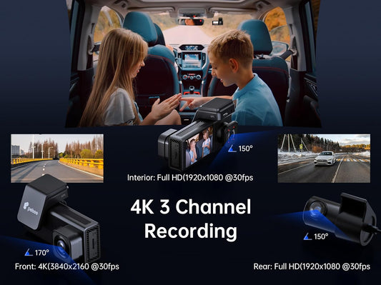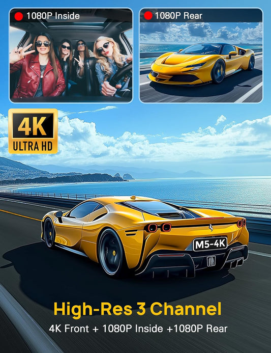 4K 3 Channel Dash Cam, 2160P+1080P+1080P Front and Rear Inside Car Camera with 64GB Card, WiFi Built-in GPS, 3“ IPS Screen, IR Night Vision, G Sensor, WDR, 24/7 Parking Mode(F3)