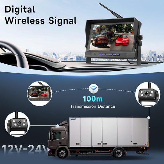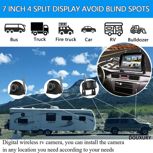 Digital Wireless Backup Camera System, Dual HD 720P Camera with Infrared Night Vision and Wide Viewing Angles, 7inch Wireless Monitor Split Screen for Trailer, RVs, Camper, 5th Wheel, etc