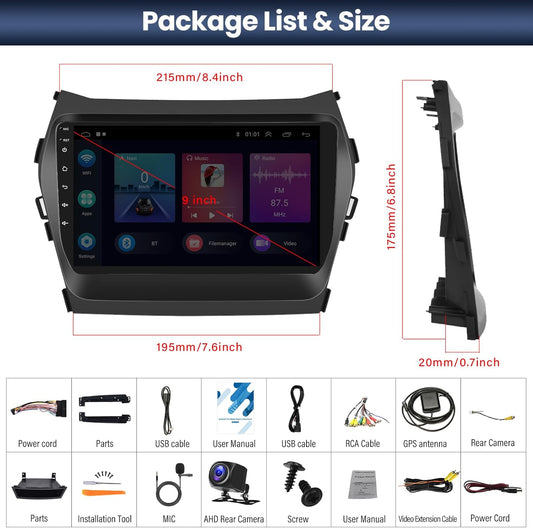 2+64G Android 13 Car Stereo for Hyundai Santa Fe IX45 2013-2018 with Apple Carplay Android Auto Mirror Link 9 inch Touch Screen FM RDS HiFi Bluetooth WiFi GPS+AHD Camera & MIC