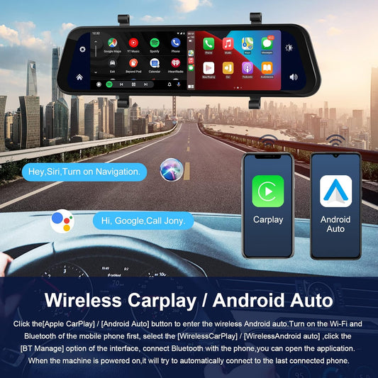 Car in-Mirror Mounted Dash Cam with Front & Rear View Camera Wireless Carplay Android Auto Car Driving Recorder with 9.66 Inch IPS Touchscreen Support DVR Voice Control Bluetooth Call FM Transmitter