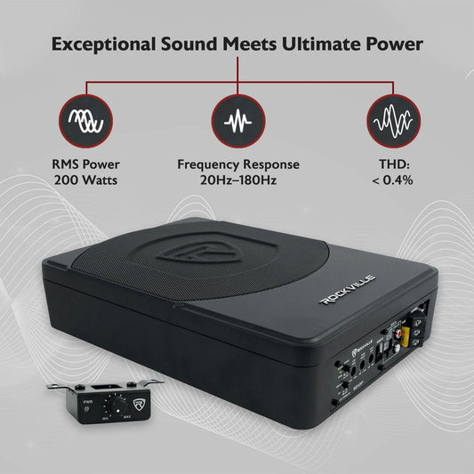 Rockville SS10P 800W Slim Under-Seat Active Car/Truck Subwoofer, Built-in Amp, Wired Remote Bass Knob, Cast Aluminum, for Car Audio Upgrades