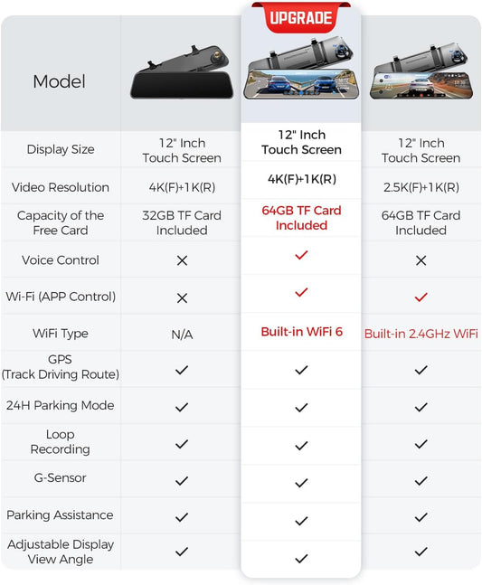 AZDOME PG17 12" 4K Mirror Dash Cam Front and Rear, Wi-Fi 6 Rear View Mirror Camera with 64GB Card, Voice Control Dash Camera for Car, Rearview Mirror Camera with GPS Night Vision Parking Assistance