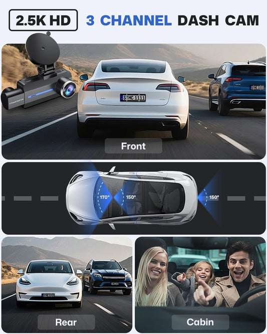Dash Cam Front and Rear 2.5K/1440P, 3 Channel Dash Camera for Cars Dash Cam Front Rear and Inside with 32GB Card, 3.16" IPS Screen, G-Sensor, Loop Recording, Night Vision, Parking Mode
