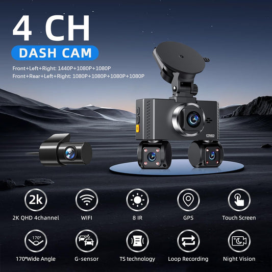4 Channel Dash Cam 360° View, Front and Rear Inside Left Right, 2K Dash Camera for Cars, Built-in 5G WiFi & APP Control, Night Vision, G-Sensor, 24/7 Recording Parking Mode, with 64GB SD Card