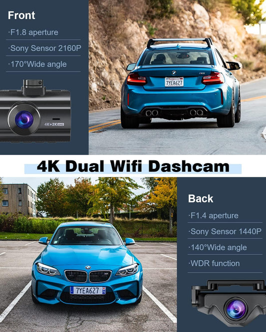 4K Dash Cam Front and Rear, Car Dash Camera Built-in WiFi GPS, Free 64GB Card, UHD 2160P Night Vision, WDR, 170°Wide Angle, WDR, 24H Parking Monitor