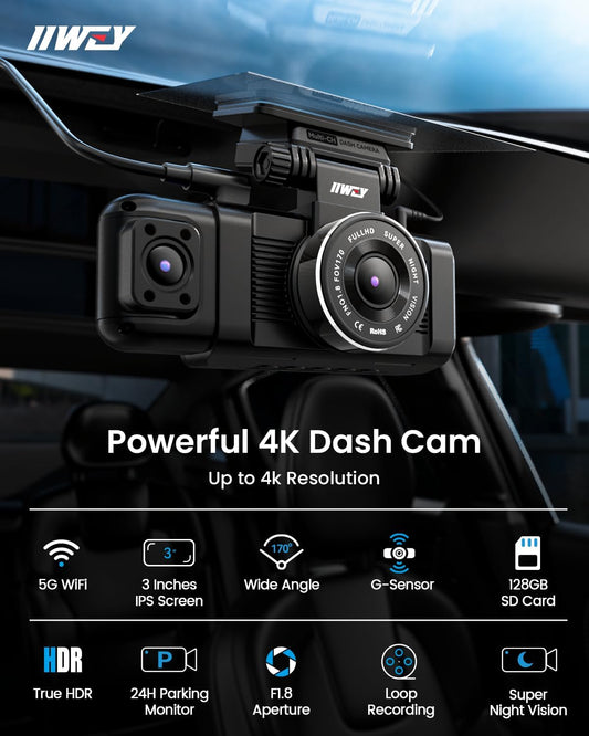 iiwey N7 3 Channel Dash Cam Front and Rear Inside 3K+1080P+1080P with 128GB SD Card, 5GHz WiFi, Rotatable Side Camera for Car, IR Night Vision, 24/7 Recording, G-Sensor, Parking Mode