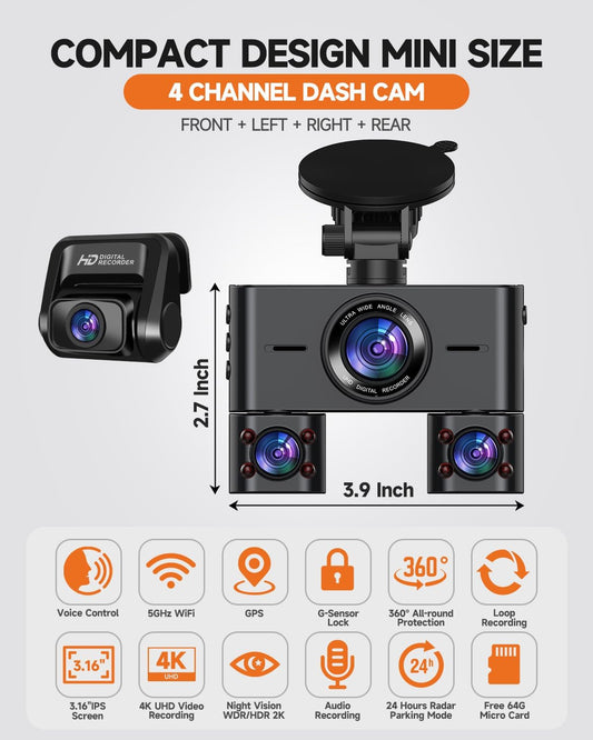 4K Dash Cam 360° View,4 Channel Front and Rear Dash Camera for Cars,Built-in 5GHz Wi-Fi GPS, Voice Control, Free 128G Card,Night Vision,24H Parking Mode,G-Sensor