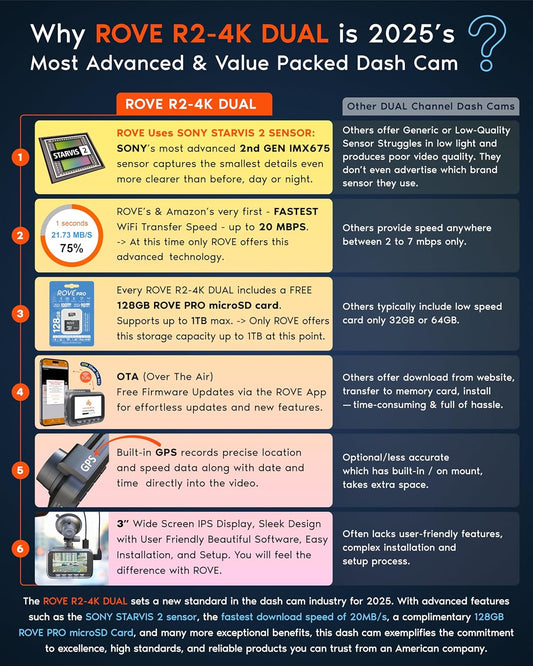 ROVE R2-4K DUAL Dash Cam Front and Rear, STARVIS 2 Sensor, FREE 128GB Card Included, 5G WiFi - up to 20MB/s Fastest Download Speed with App, 4K 2160P/FHD Dash Camera for Cars, 3" IPS, 24H Parking Mode