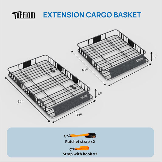 TUFFIOM 250lbs 64 x 39 x 6 inch Extendable Roof Top Cargo Carrier Basket w/Net+Storage Bag+Footrest+Straps, Heavy Duty Rooftop Luggage Holder Steel Rack for SUV Car Truck Van Travel Camping