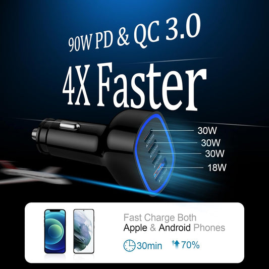 90W 4-Port Super Fast USB C Car Charger for Samsung Galaxy A17/A16/A56/A36/A15/A55/S25/S24/Ultra iPhone 16e/16 Pro Max Pixel 9a 9 Pro Android USB-C & USB-A Car Phone Charger Cigarette Lighter Adapter