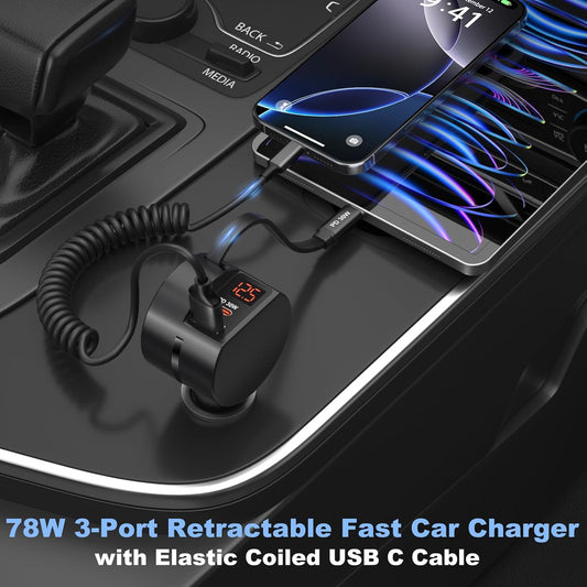 [2025 Upgraded] 81W Retractable PD Car Charger with Bluetooth 5.3, FM Transmitter, Hands-Free Calling, MP3 Player, USB & LED Display – USB-C Bluetooth Adapter for All Phones