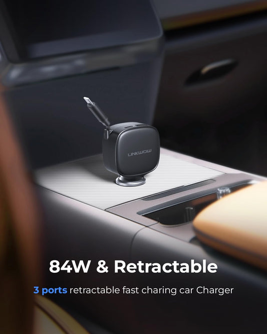 Retractable Car Charger USB C, 84W Max, Ultra-Compact, Type-C Fast Charger with Built-in Retractable USB-C Cable, Car Adapter for iPhone 16/15 Series, MacBook Pro/Air, iPad, AirPods Black