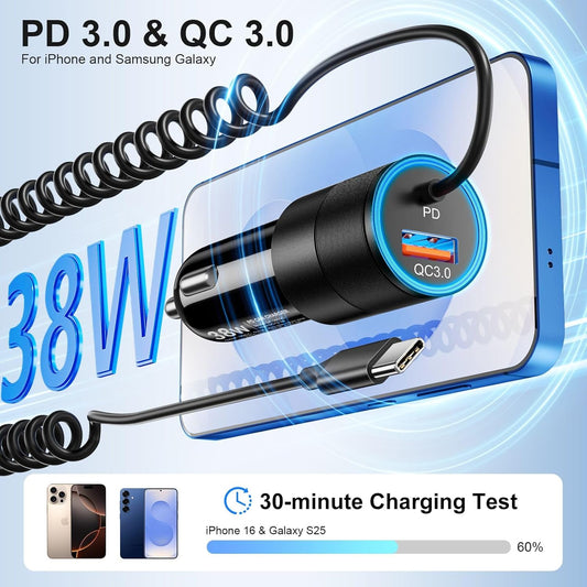 Car Charger USB C,38W Super Fast Car Adapter with PD 3.0 Bulit in 3.5FT USB C Coiled Cable,Car Phone Charger Fast Charging Compatible with iPhone 16/15 Pro Max,Galaxy S25/S24/S23 Note 20/10,Pixel