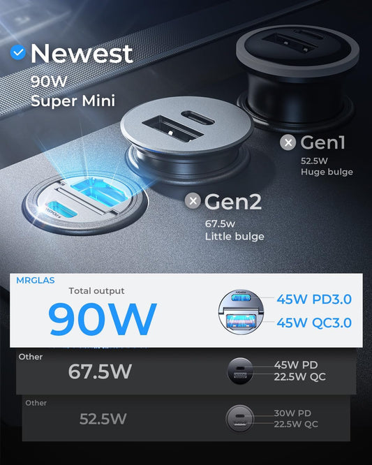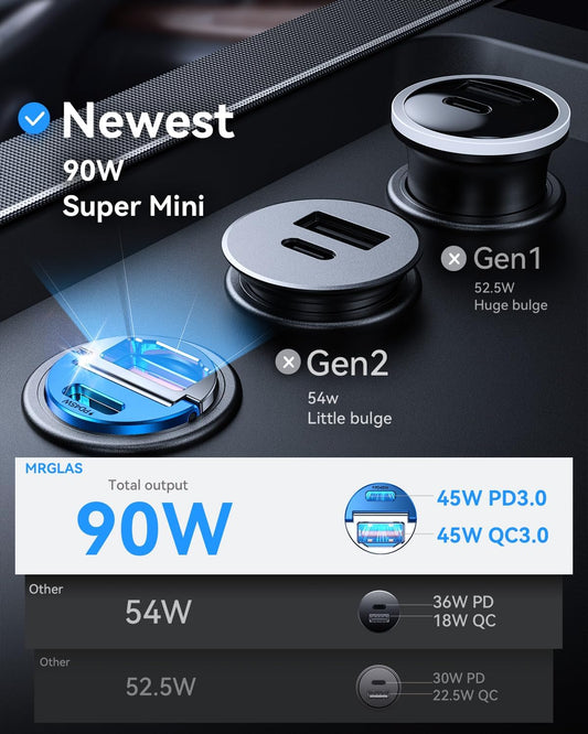 MRGLAS 90W USB C Car Charger Fast Charging,[Invisible Design] All Metal Car Charger USB C PD45W+QC3.0 Dual Port Cigarette Lighter Car Adapter for iPhone 16 Pro Max Plus 15 14 iPad SamsungS25 S24 Ultra