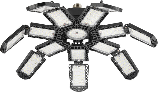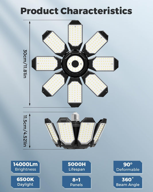Adiding LED Garage Ceiling Lights 14000Lm w/ 8 Adjustable Panels, Super Bright Deformable Basement Light Bulb Fixture Screw in E26 Bulbs Socket for Indoor Shop, Workshop, Attic, Barn, Bay, Home Gym