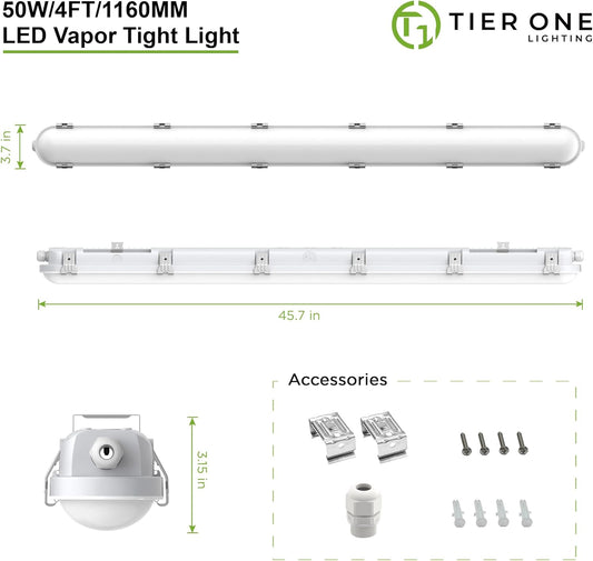 TIERONE 4ft LED Vapor Tight Light 50W Outdoor Shop Light IP65 Waterproof 0-10V Dimmable Integrated LED White Strip Lighting Fixture for Warehouses Car Washes 5000K 100-277V 6000LM ETL Listed 4 Pack
