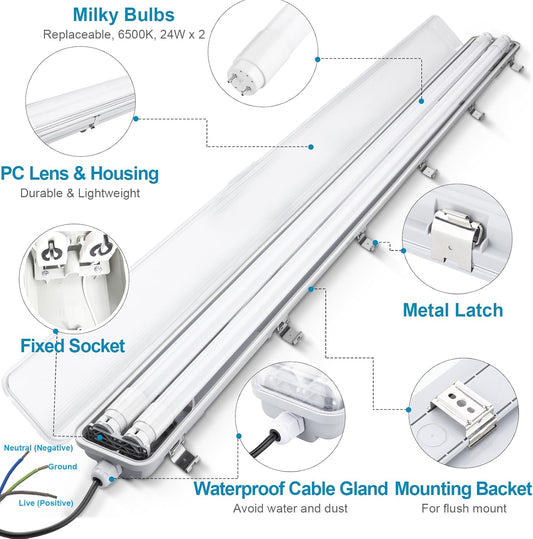 4FT Vapor Tight LED Light Fixture 4200LM 48W, 6500K Bright White IP65 Waterproof for Warehosue, Factory, Workshop, Garage, Car Wash,Indoor/Outdoor Ceiling Lights (8-Pack)