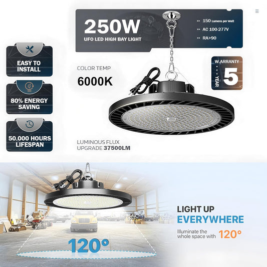 250W UFO LED High Bay Light,30000lm 6000K Daylight 2500W Equivalent with US Plug Cable LED Garage Lights Commercial Warehouse Area Light Workshop Garage Factory Lowbay Area Lighting