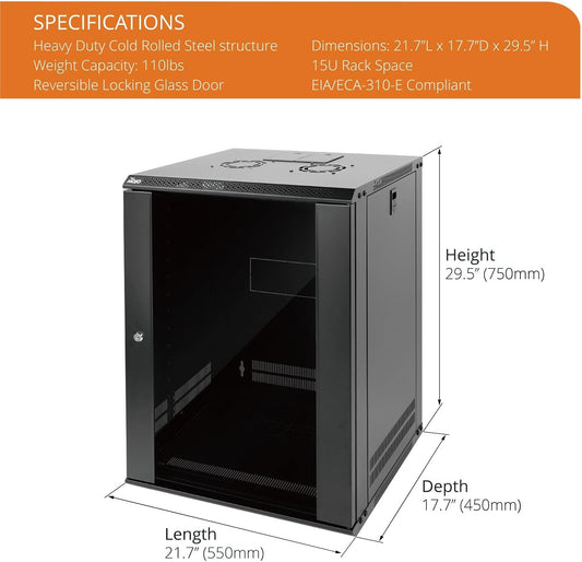 Tecmojo 15U Wall Mount Rack Network Cabinet for 19" IT Equipment,with Lockable Glass Door and Side Panels,Cooling Fan,17.7inch Depth,Black (15U)