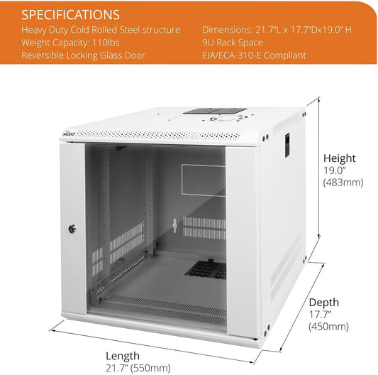 Tecmojo 9U Wall Mount Server Cabinet IT Network Rack Enclosure Lockable Door and Side Panels Black,Cooling Fan, Glass Door, 17.7inch Depth,for 19” IT Equipment, A/V Devices