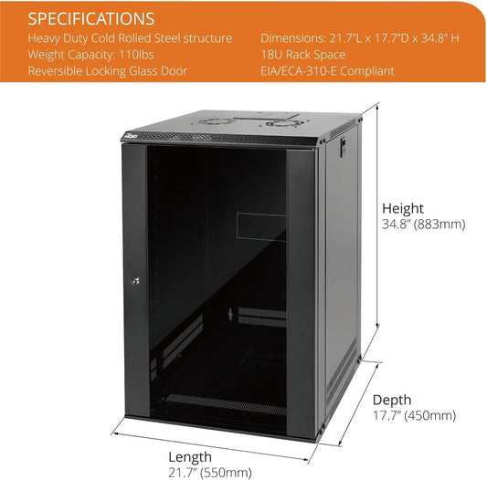 Tecmojo 18U Wall Mount Rack Network Cabinet for 19" IT Equipment,with Lockable Glass Door and Side Panels,Cooling Fan,Black,17.7inch Depth for AV/Computer/Electronics Equipment Data Rack