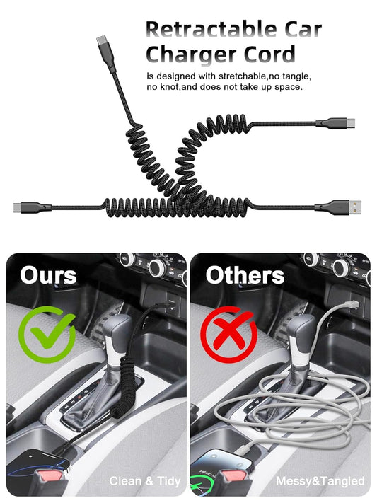 Car Carplay Cable 2Pack 3ft Coiled USB A to USB C Fast Charge Cord for iPhone 16/15/Plus/Pro Max/MacBook Pro, Auto Coiled Retractable iPhone Car Cord