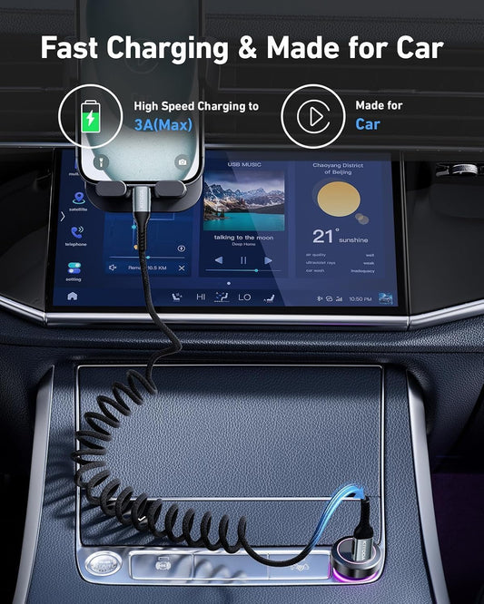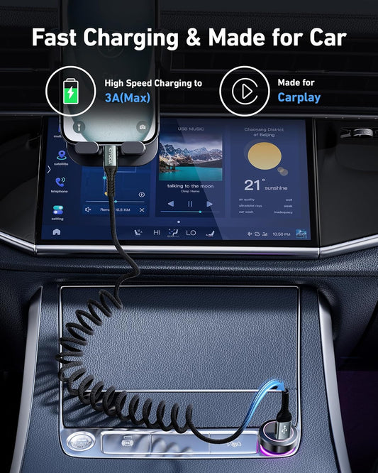 USB C Cable for Car 3FT/6FT, Coiled USB C to USB C Cable Fast Charging 66W, Braided USB Type C Charger Cord Compatible with iPhone 16 15 Pro Max, Samsung Galaxy, Google Phones and More Type C Devices