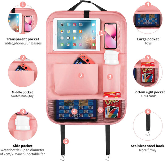 LUCMO Car Backseat Organizer with Touch Screen Tablet Holder,9 Storage Pockets Car Storage Organizer,Protectors Kick Mats Travel Accessories for Kids-Pink