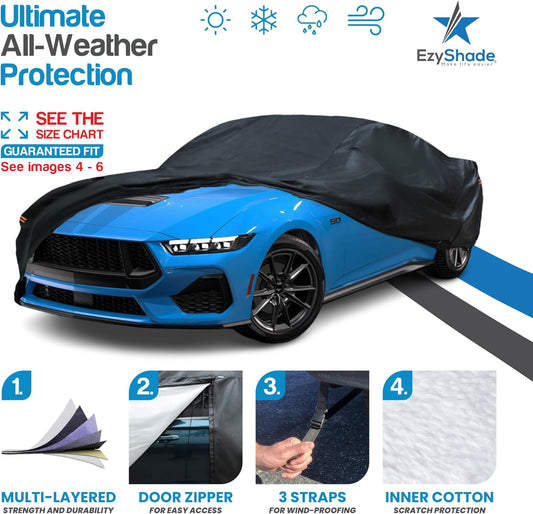 EzyShade 10-Layer Waterproof Sports Car Cover. See Vehicle Size-Chart for Accurate Fit. All Weather Outdoor Covers. Camaro Challenger Firebird GTO. Sun Snow Rain. Black, Size C5 (See SizeChart)