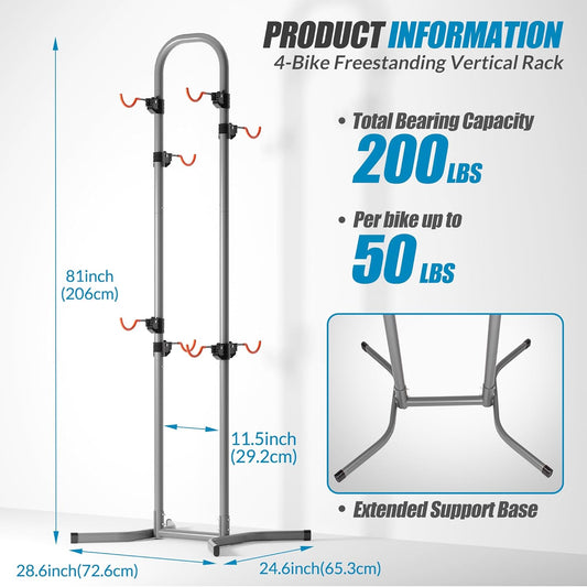 4 Bike Stand Rack with Storage – Bike Rack Floor Stand- Garage Organizer - 2024 Upgrade Tube Diameter 19mm with 8 Sponge Columns - Indoor Bike Storage for Parking Road, Mountain, Hybrid or Kids Bikes